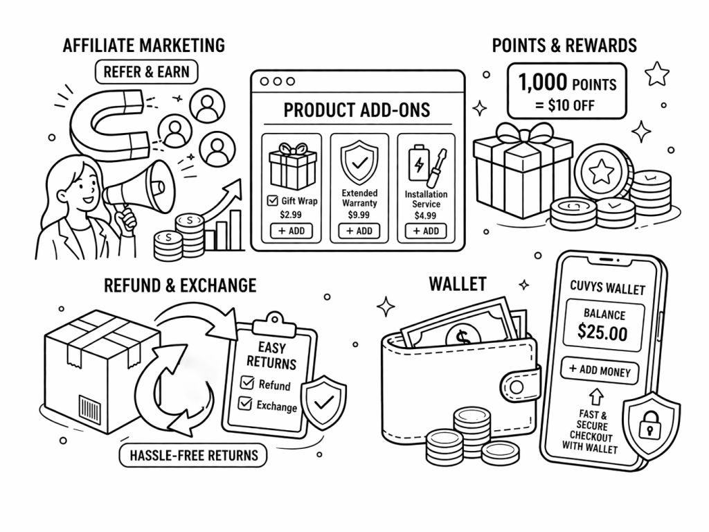 We saw businesses struggling to add features like affiliates, rewards, wallets, and product add-ons without complex setups or costly development. Cuvys was built to simplify this.