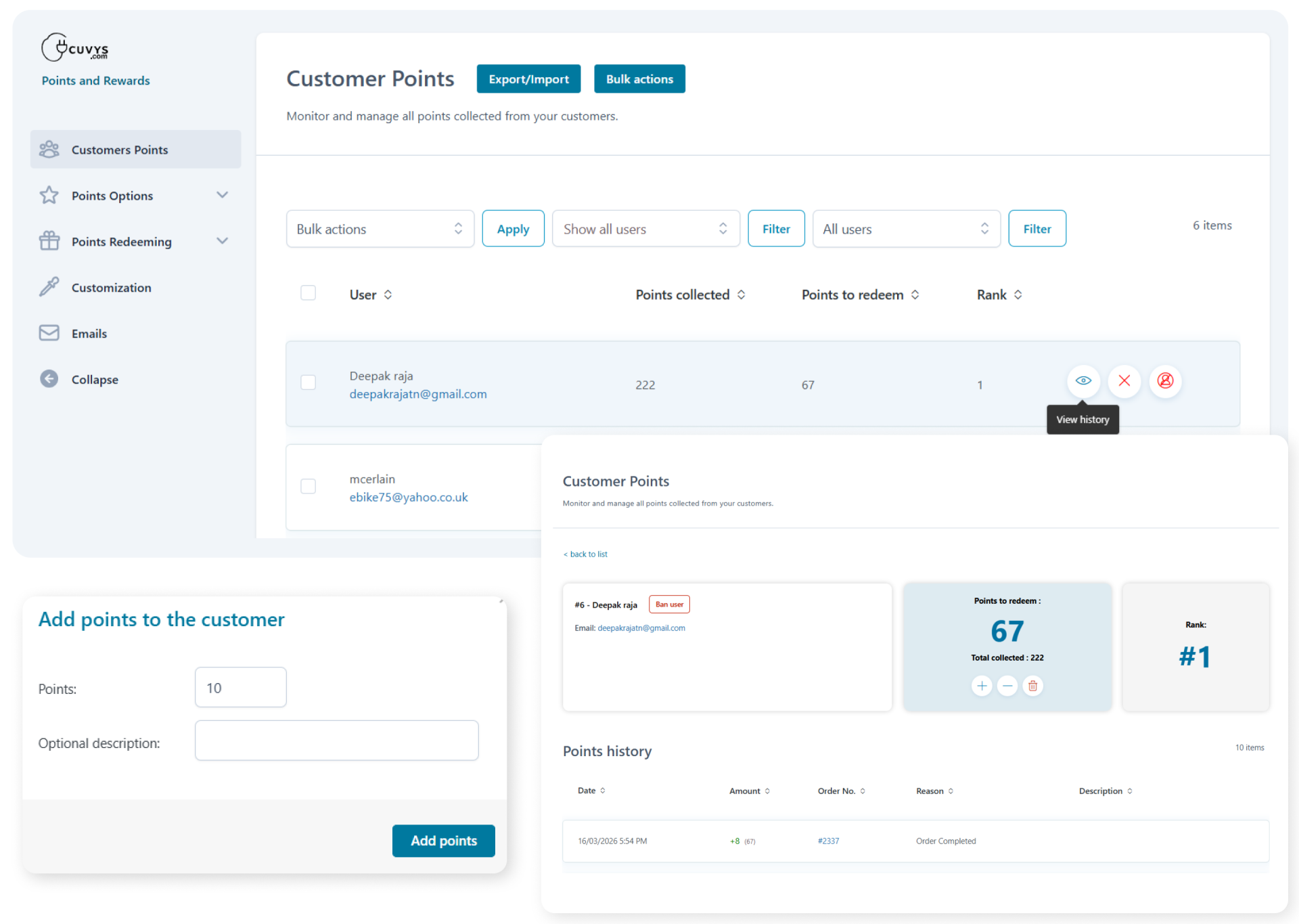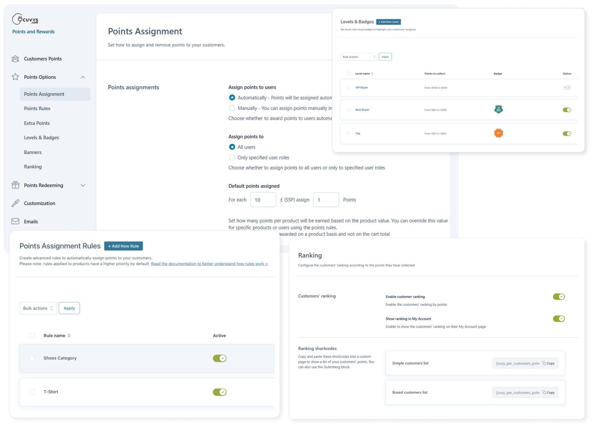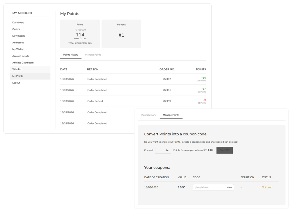 Configure how points are assigned, set earning rules, offer extra points, create levels and badges, display banners, and rank customers to enhance engagement and loyalty.