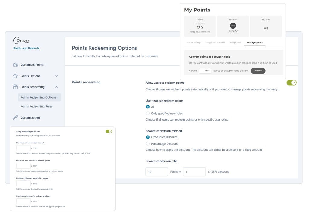 Configure how customers redeem points by setting conversion rates, minimum thresholds, and discount types, allowing flexible redemption options that enhance user experience and encourage more purchases.