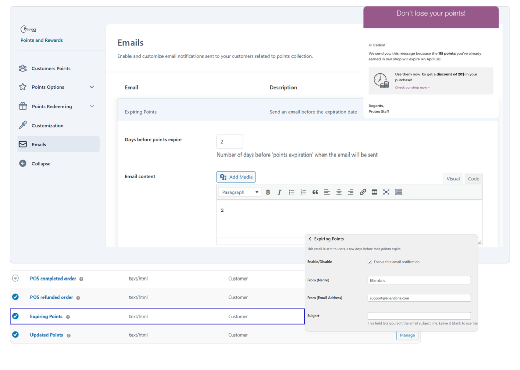 Email settings allow you to customize and send automated notifications about points updates, rewards, and expiry. You can edit subject, content, and triggers to keep customers informed and engaged.