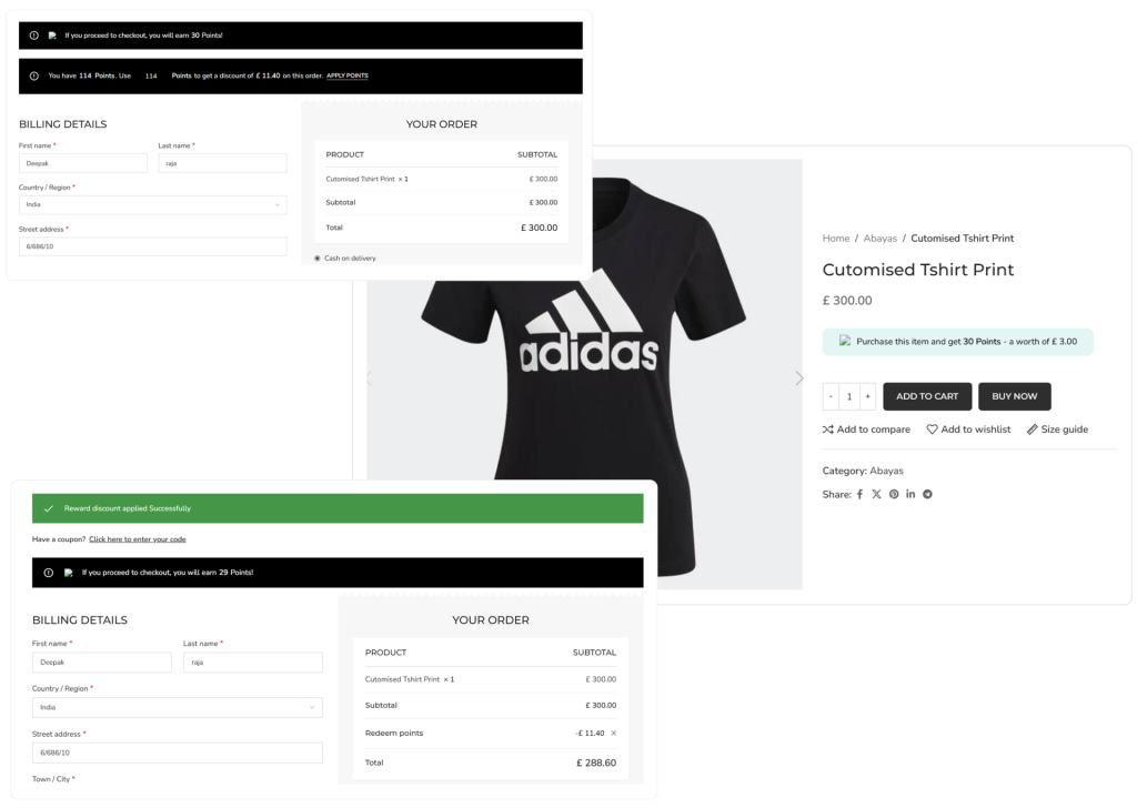 Customers see reward messages on product, cart, and checkout pages, showing earned points and savings, and can easily convert points into rewards for discounts on future purchases.