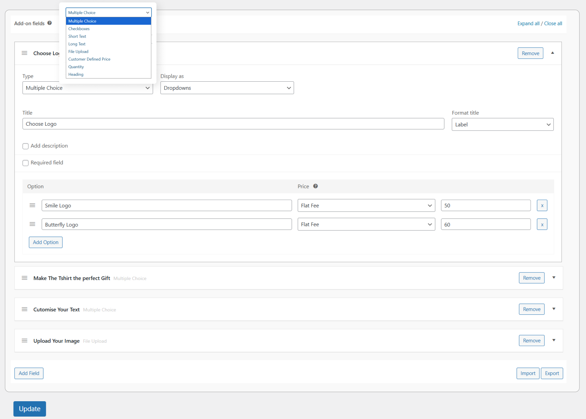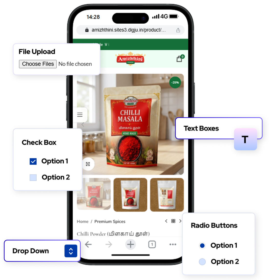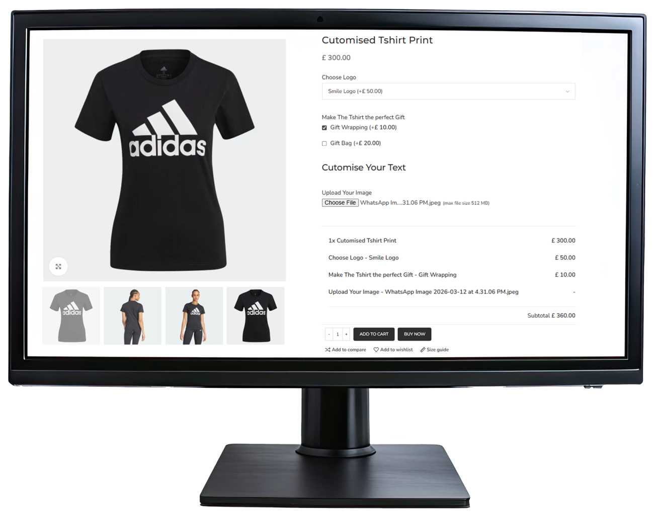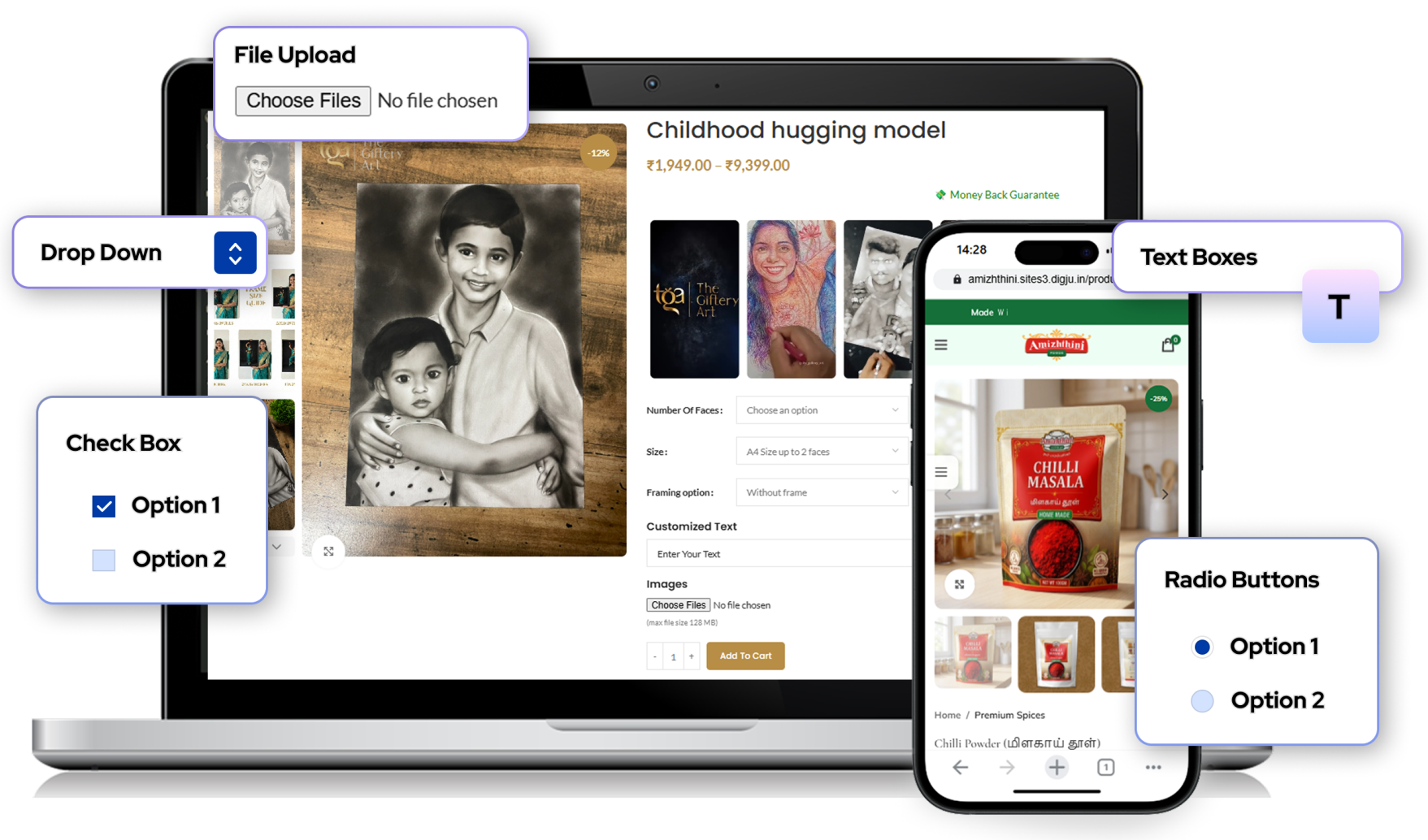 You can add extra options such as dropdowns, radio buttons, checkboxes, or text fields directly on the product page so customers can customize products before purchasing.